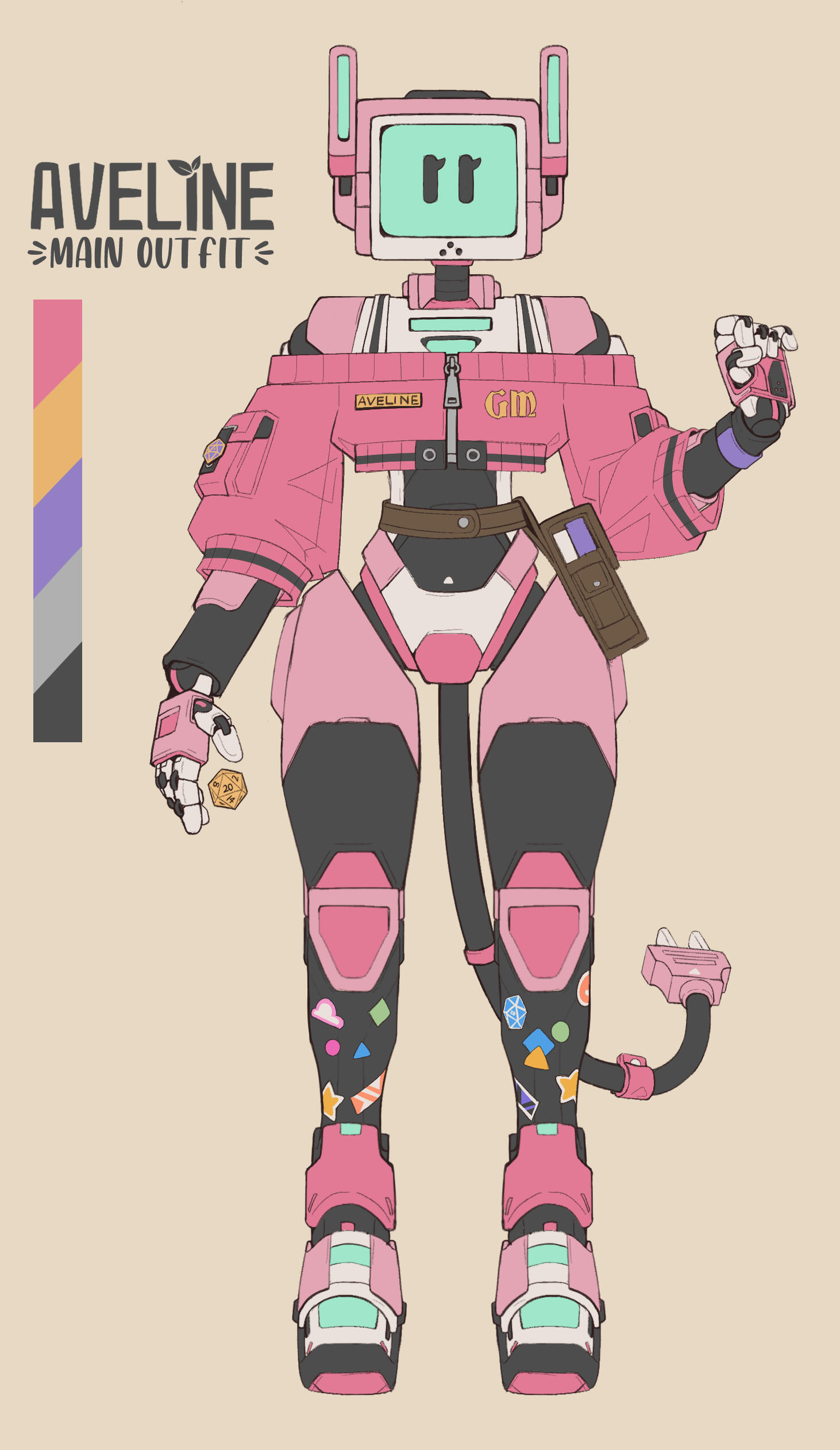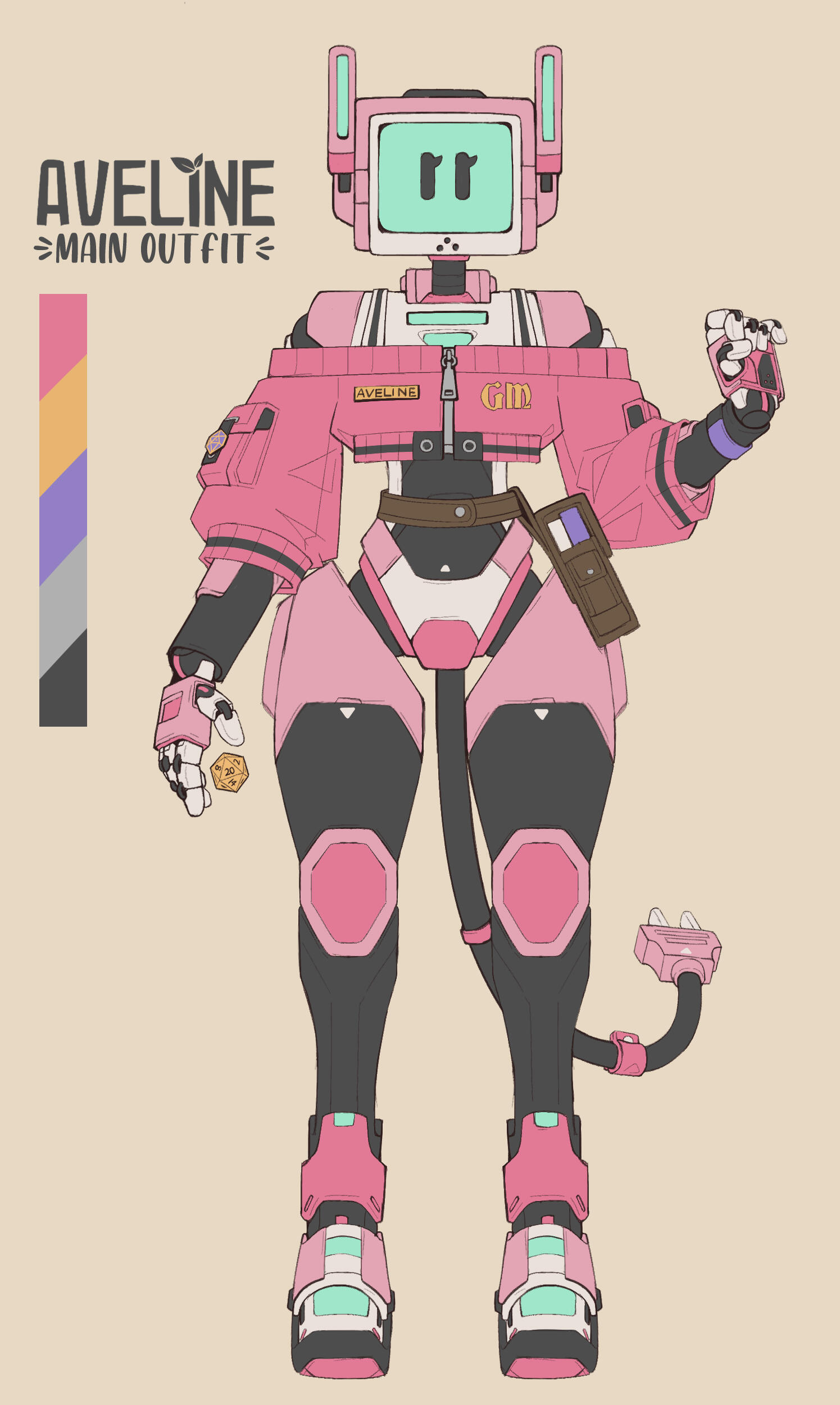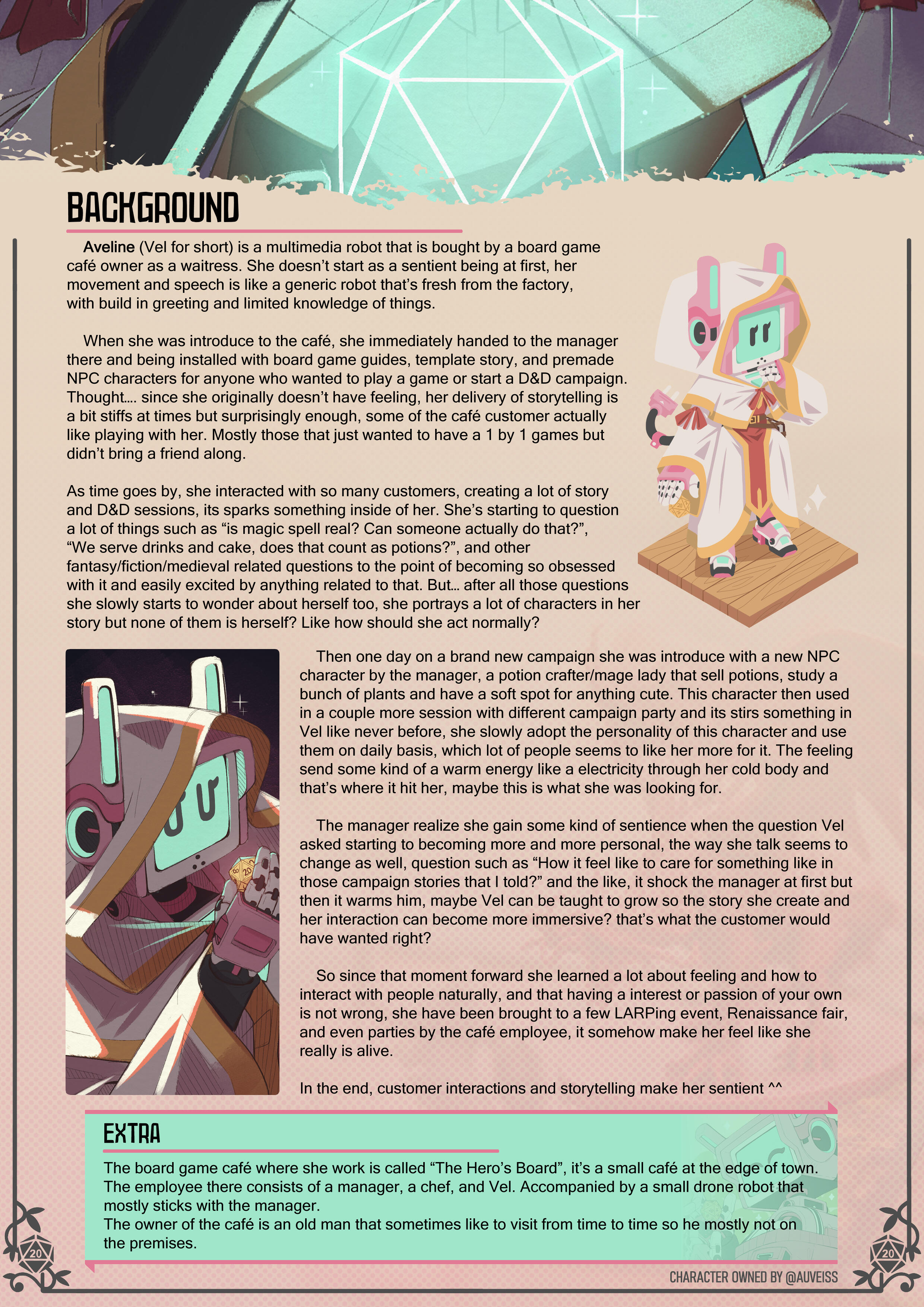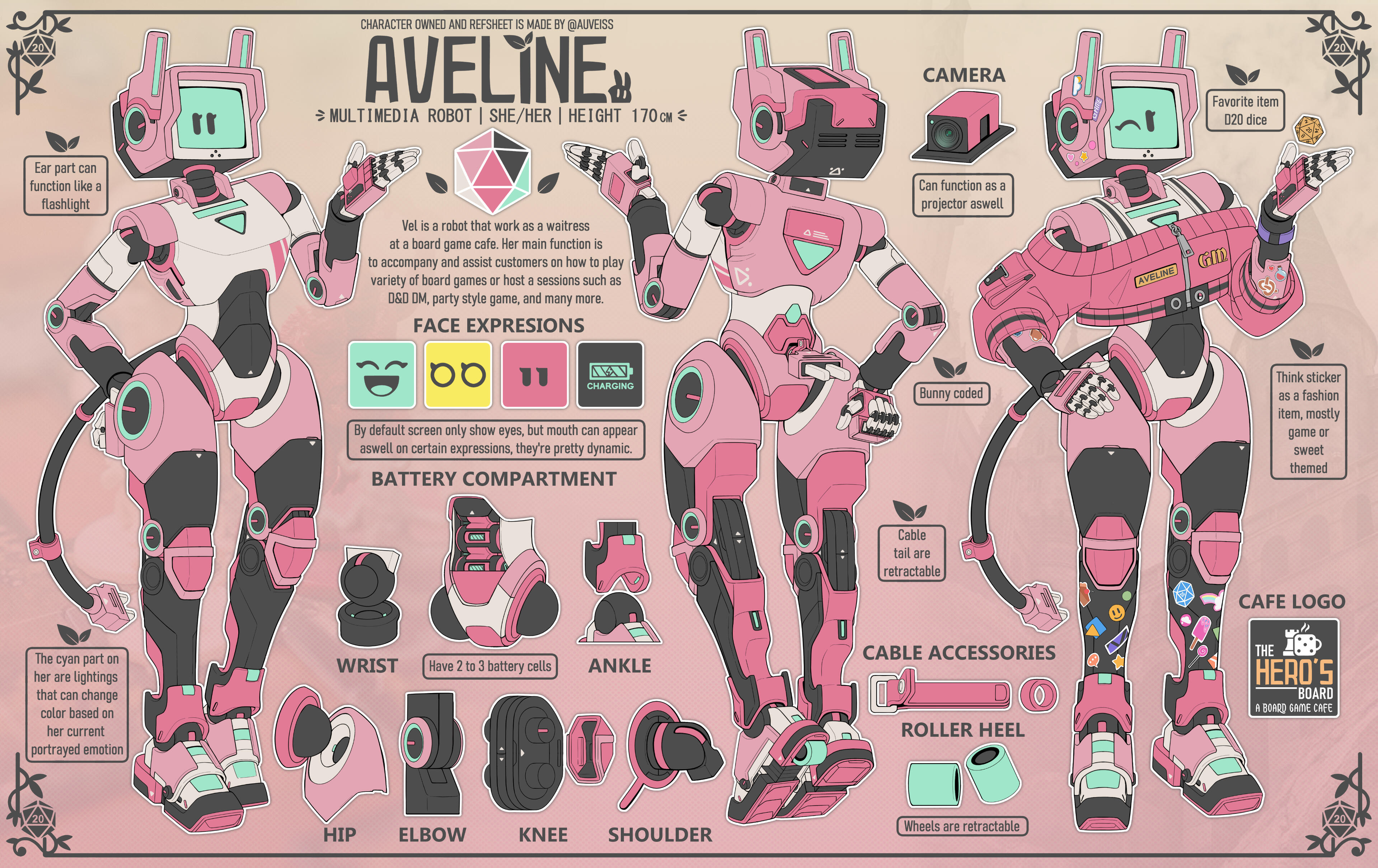 Aveline or Vel for short, is a multimedia robot that work at a boardgame cafe/hobby shop named "The Hero's Board". Her main function is to accompany customer on how to play board game and other waiter tasks.